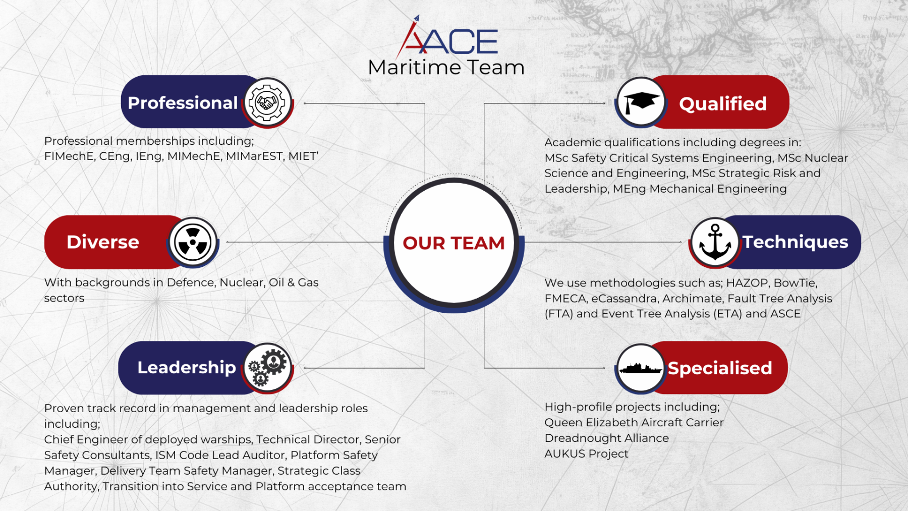 AACE provides comprehensive services in the maritime domain, integrating safety engineering, legislative and regulatory compliance, certification management and environmental support to meet the complex requirements of MOD and Defence Industry.